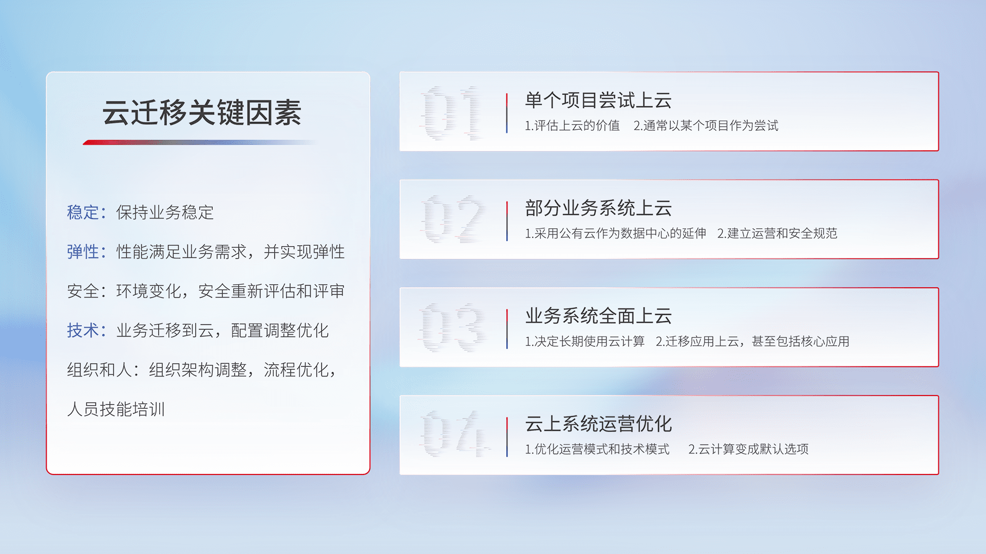 结合实际业务,,从规划设计、、云平台选型、、云原生改造、、数据迁移、、集成交付,,,迁移全过程为客户识别最佳上云路径,,,做好风险识别管理,,,,设计网络架构、、、身份权限、、、、安全审计合规、、、、操作审计、、日志审计、、、、监控告警策略、、多站点容灾设计等,,对云上基础设施进行整体规划,,,,提升IT治理水平,,,,以满足弹性、、、、高可用、、高性能的需求。。