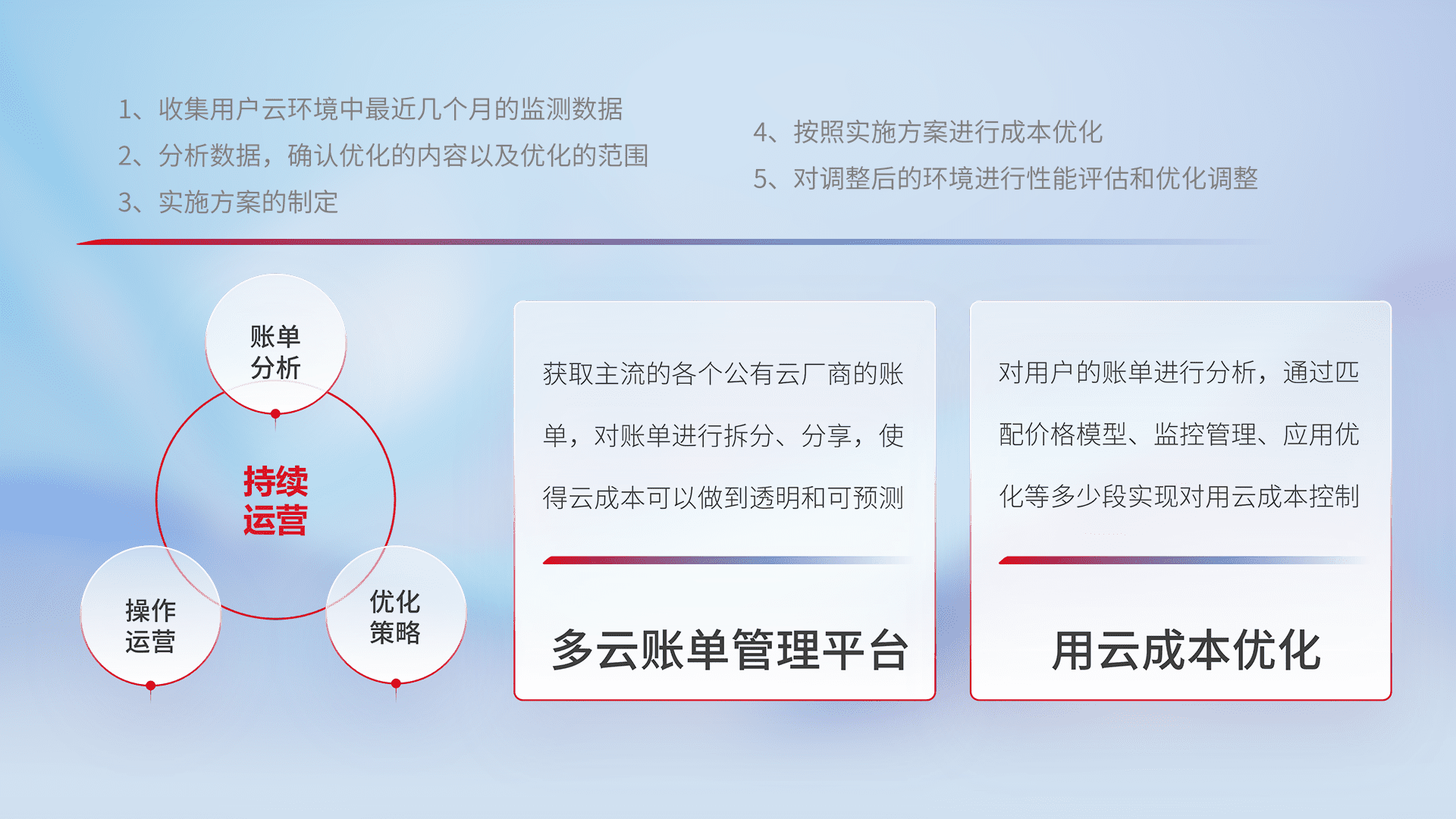 通过多云纳管,,,以统一的资源数据模型把客户的云资源进行抽象和封装,,,进而实现对多云资源的统一操作,,,保障云资源管理的可靠性、、、、稳定性与可用性。。。。量身定制化运维内容,,,,配置、、开发运维、、补丁管理、、、备份、、、、监控、、认证和访问管理、、、审计和日常巡检等,,,保障在用云过程中的可靠度,,,稳定度以及高可用率。。。。