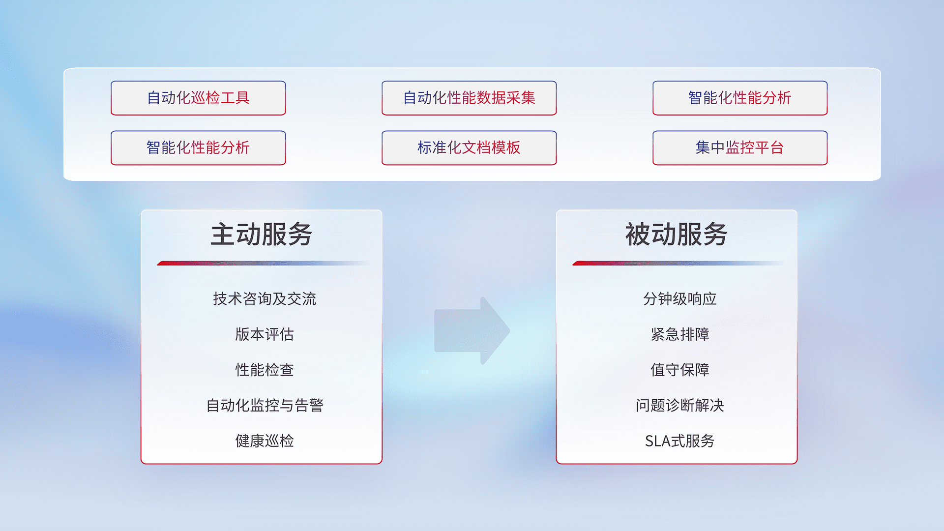智能化工具和标准化文档,,,保障服务质量,,,提供主动服务(包含技术咨询、、版本评估、、、、性能检查、、、自动化监控与告警、、健康巡检)和被动服务包含(分钟级响应、、、、紧急排障、、值守保障、、、问题诊断解决、、、SLA服务)。。。